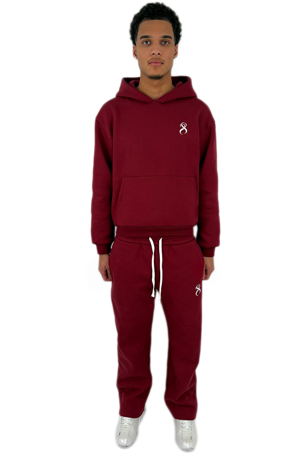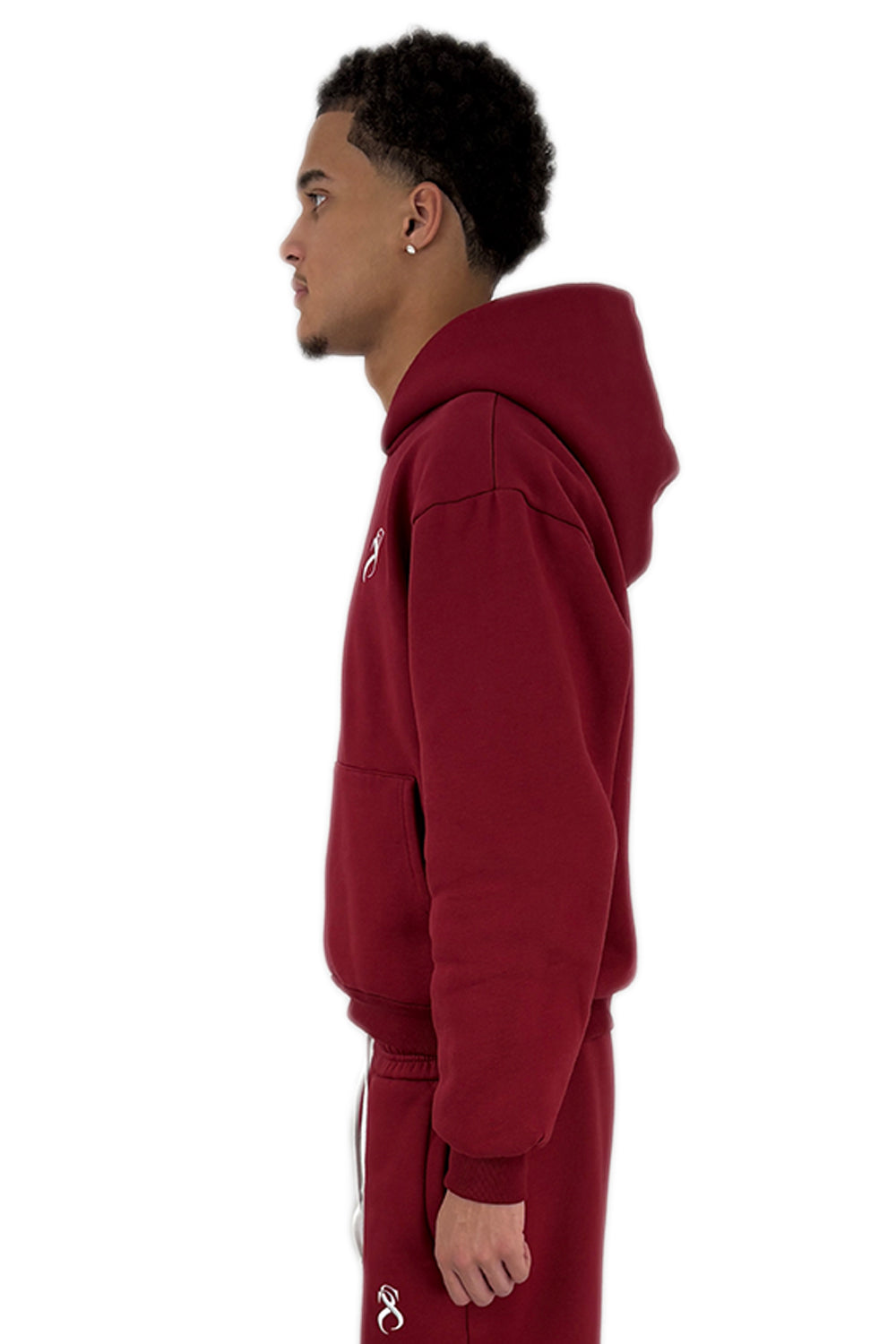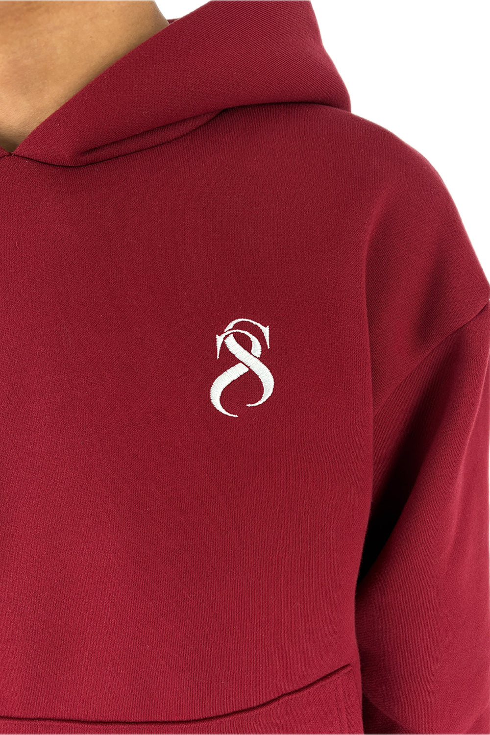 This hoodie is crafted from a heavy wine red cotton blend. Distinguished by a custom-developed cut and a signature oversized hood, the design features an white embroidered logo on the chest. Thanks to the thick fabric quality, it feels soft to the touch while maintaining a firm, structured shape.